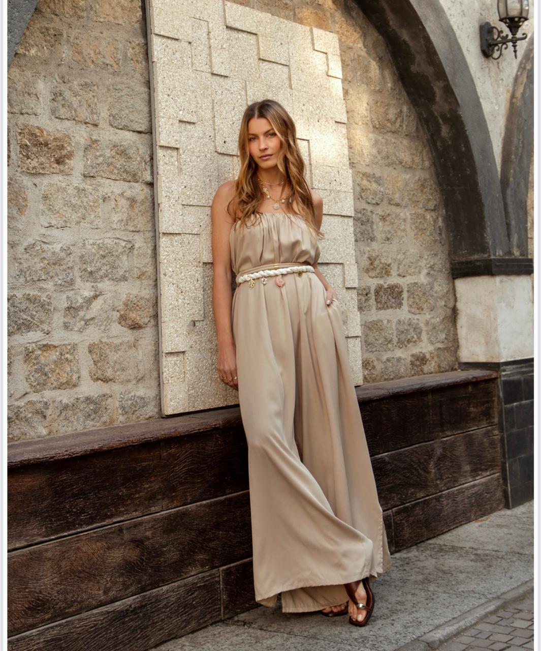 Macacão tomara que caia em tecido leve, com caimento fluido e toque sofisticado. Acompanha lindo cinto com aplicações. Ideal para produções elegantes de verão, do dia à noite.